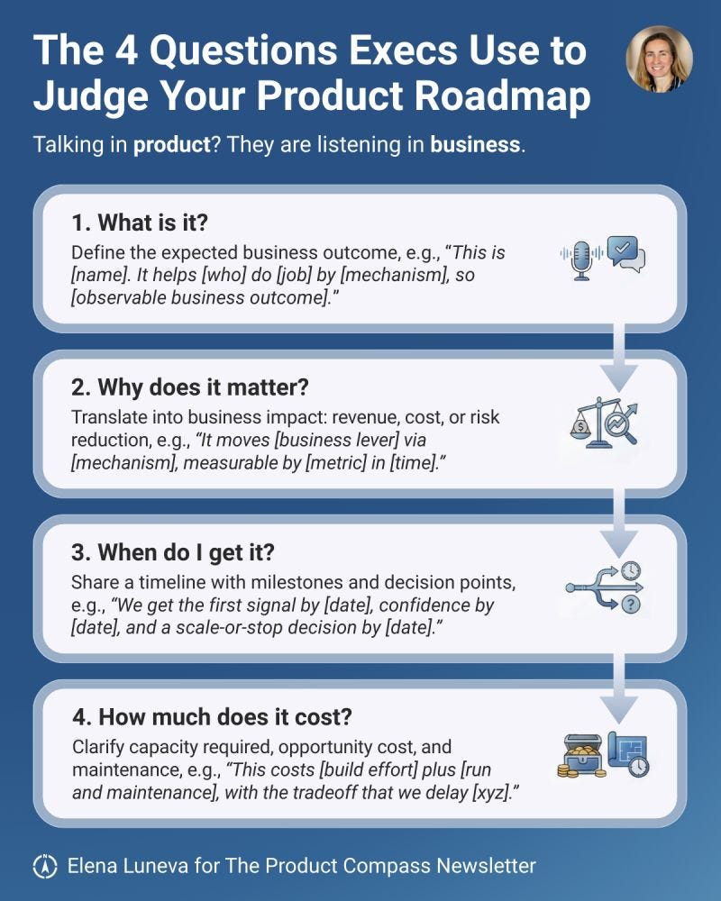 How to talk roadmaps to execs. Pawel Huryn shares powerful advice: stop speaking product, and translate your message to business outcomes. Frame features by 4 exec questions: what it is, why it matters (quantified), when we learn, and full cost. Use learning milestones instead of ship dates to build trust and speed approvals