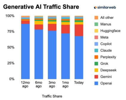 70%: ChatGPT’s share of genAI web traffic dipped below 70% over the past year while Gemini climbed toward ~20% (and Grok kept gaining)